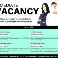 Interested candidates should send their CVs via Email or WhatsApp: info@lakegalaresort.com | 077 777 4008