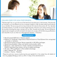“Edinborough” has run up to be one of the best food manufacturers in the business. We personify our business, try to be different and aim at greater heights to offer the best quality food products to our clientele. We are young and reviving combined with maturity that comes with five decades of market presence. Currently we are the largest Exporter of Sauces in Sri Lanka covering up over 26 countries including the major markets such as USA, Canada and Europe. We are looking for experienced, energetic and self motivated individuals who comply with the following qualifications and requisites to join our team as a Management Assistant Production.