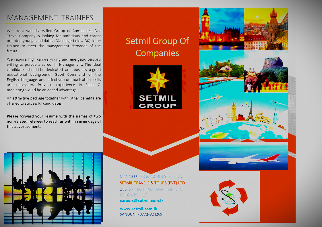 We are a well-diversified Group of Companies. Our Travel Company is looking for ambitious and career oriented young candidates (Male age below 30) to be trained to meet the management demands of the future.