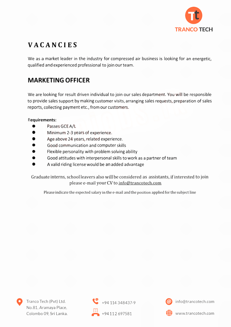 Graduate interns, school leavers also will be considered as assistants, if interested to join please e-mail your CV to info@trancotech.com
