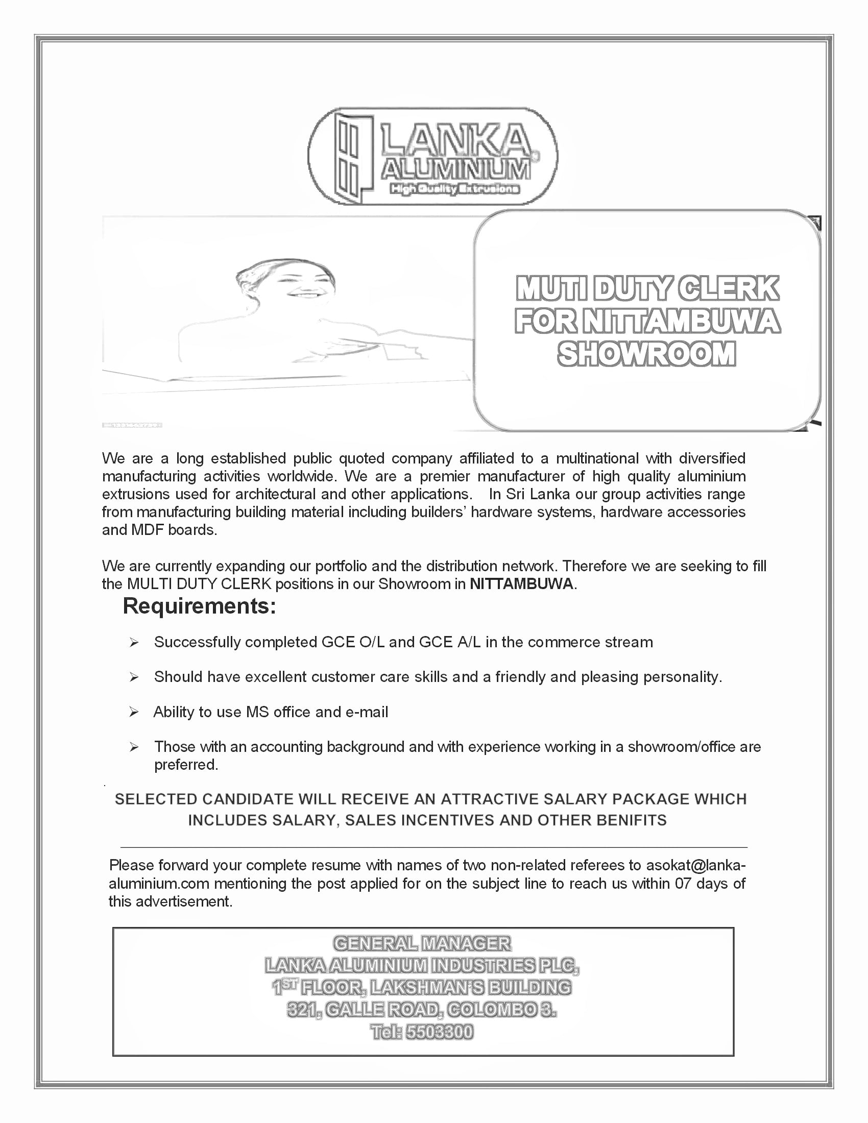 asokat@lanka-aluminium.com mentioning the post applied for on the subject line to reach us within 07 days of this advertisement.