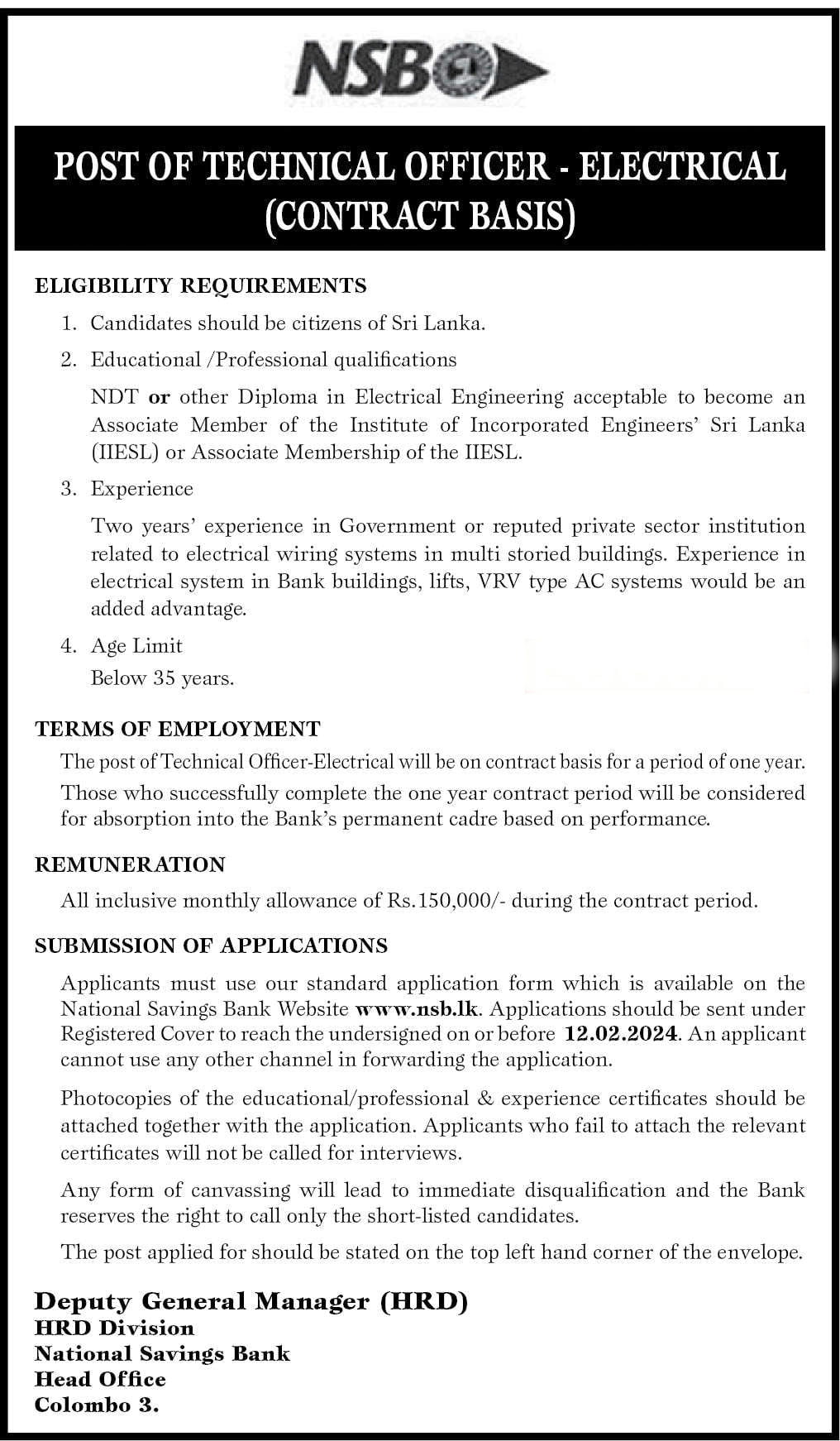 Applicants must use our standard application form which is available on the National Savings Bank Website www.nsb.lk. Applications should be sent under Registered Cover to reach the undersigned on or before 12.02.2024. An applicant cannot use any other channel in forwarding the application.