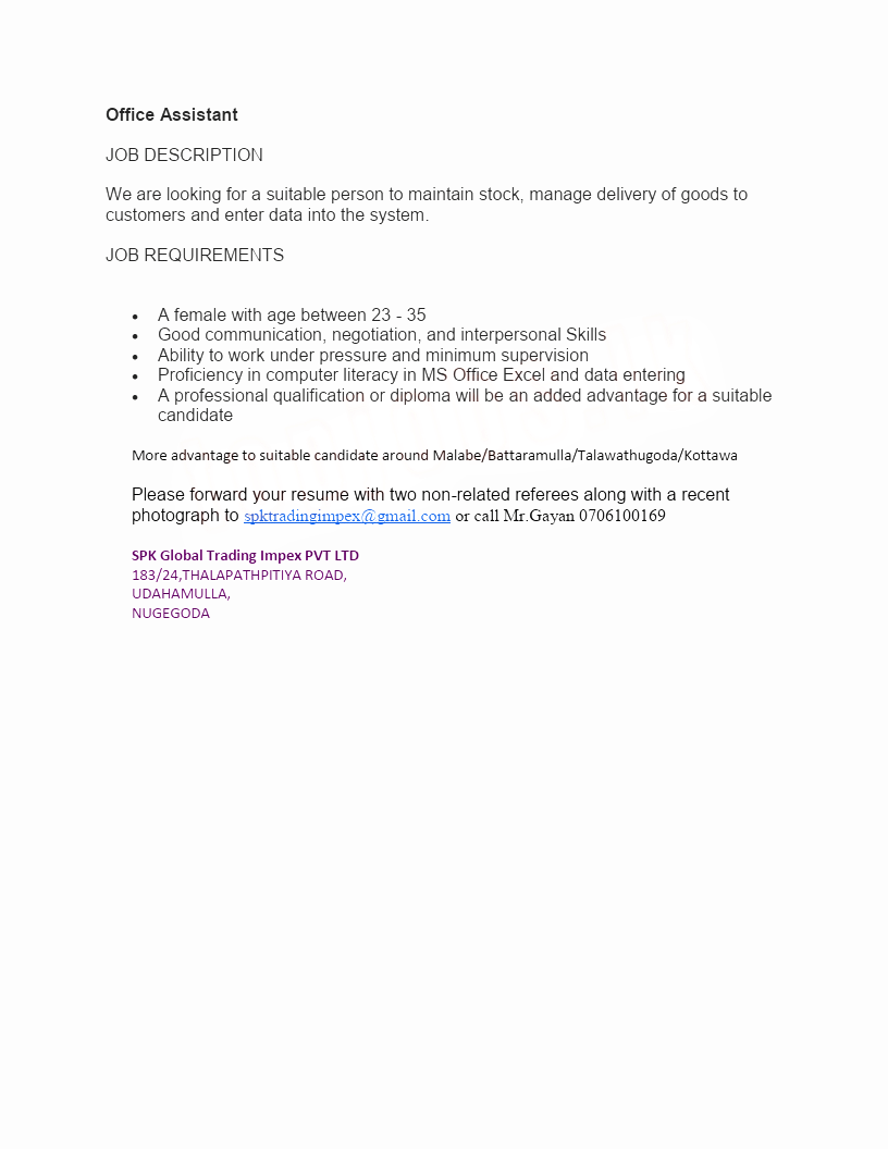 Please forward your resume with two non-related referees along with a recent photograph to spktradingimpex@gmail.com or call Mr. Gayan 0706100169