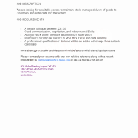 We are looking for a suitable person to maintain stock, manage delivery of goods to customers and enter data into the system.