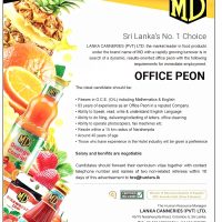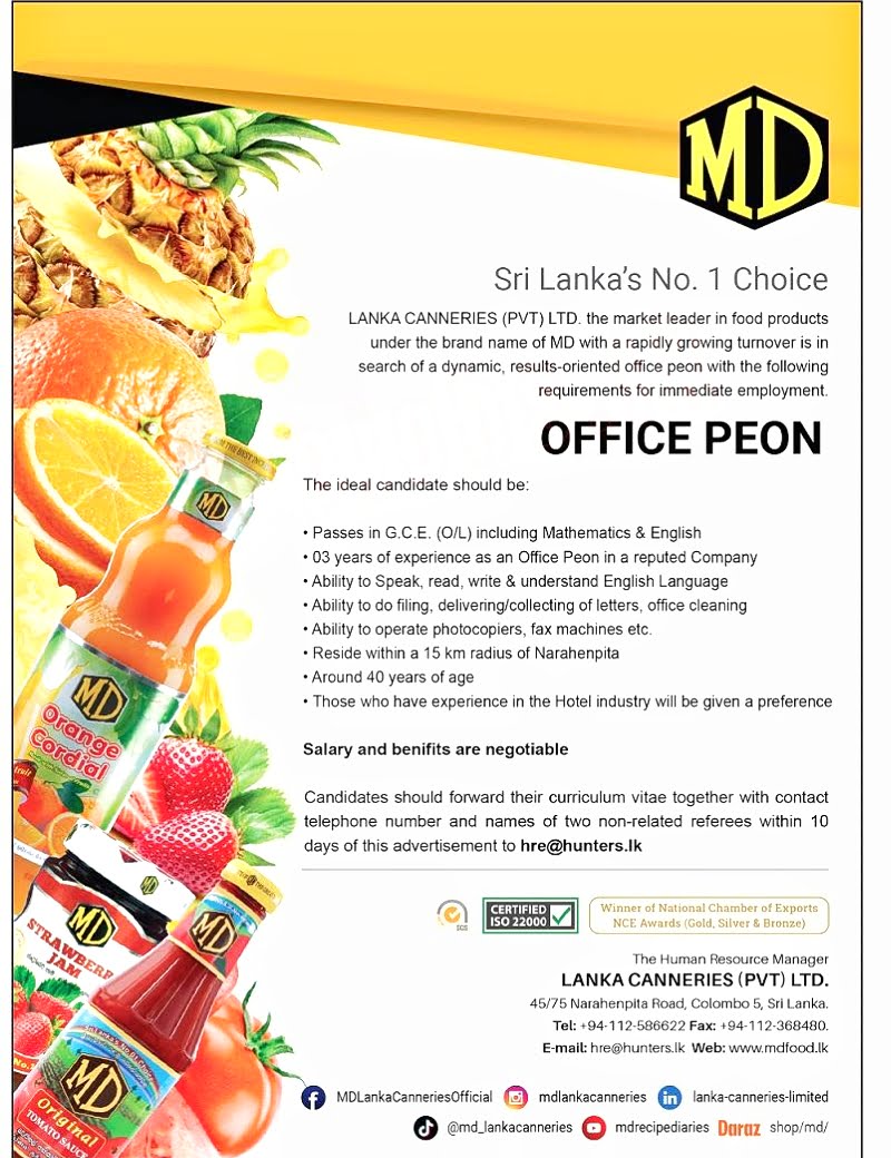 LANKA CANNERIES (PVT) LTD. the market leader in food products under the brand name of MD with a rapidly growing turnover is in search of a dynamic, results-oriented office peon with the following requirements for immediate employment.