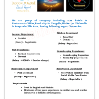 having following urgent Vacancies, Account Departmer • Cashier ( Salary Negotiable) F&B Department • Barman (Experienced) · Stewart (Salary – 45000/= + Service charge) Kitchen Department • Sous Chef Commi – 1 (Salary -Negotiable) Housekeeping Department · Housekeeping Supervisor Room Boy (Experienced) (Salary – Negotiable ) Maintenance Department · Pool attendant (Salary – Negotiable ) Requirements Good in English and Sinhala Reservation Department • Reservation assistant Cum Social Media Coordinator (Salary – Negotiable ) • Minimum of two years experience in similar role and similar industry is a definite advantageous. Accommodation & Food is provided. Please forward your CV to, account@lagoonparadisebeachresort.com or contact 0472242528/0472242509