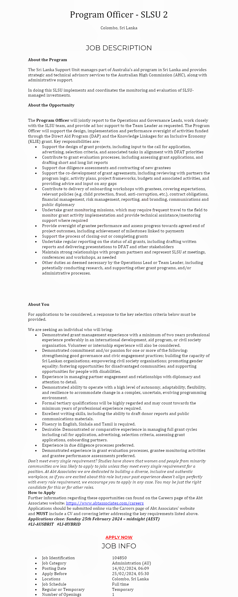 Associates website: https://www.abtassociates.com/careers Applications should be submitted online via the Careers page of Abt Associates’ website. and MUST include a CV and covering letter addressing the key requirements listed above. Applications close: Sunday 25th February 2024-midnight (AEST)