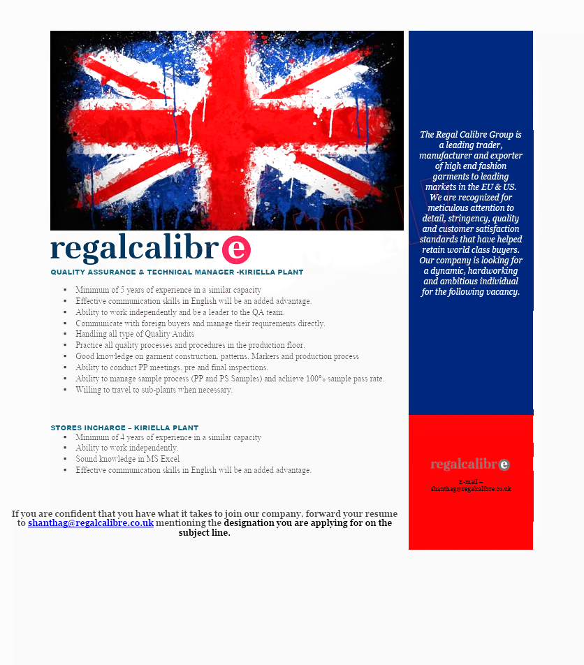 The Regal Calibre Group is a leading trader, manufacturer and exporter of high end fashion garments to leading markets in the EU & US. We are recognized for meticulous attention to detail, stringency, quality and customer satisfaction standards that have helped retain world class buyers. Our company is looking for a dynamic, hardworking and ambitious individual for the following vacancy.