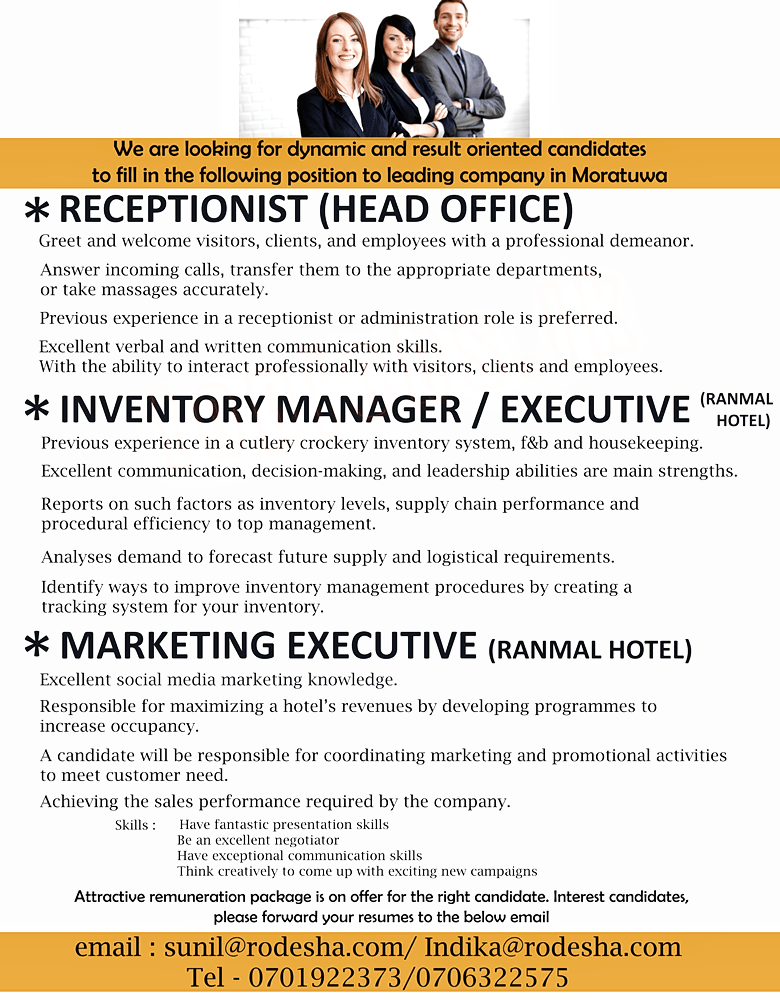 We are looking for dynamic and result oriented candidates to fill in the following position to leading company in Moratuwa