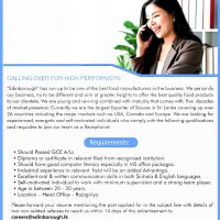 “Edinborough” has run up to be one of the best food manufacturers in the business. We personify our business, try to be different and aim at greater heights to offer the best quality food products to our clientele. We are young and reviving combined with maturity that comes with five decades of market presence. Currently we are the largest Exporter of Sauces in Sri Lanka covering up over 26 countries including the major markets such as USA, Canada and Europe. We are looking for experienced, energetic and self motivated individuals who comply with the following qualifications and requisites to join our team as a Receptionist.
