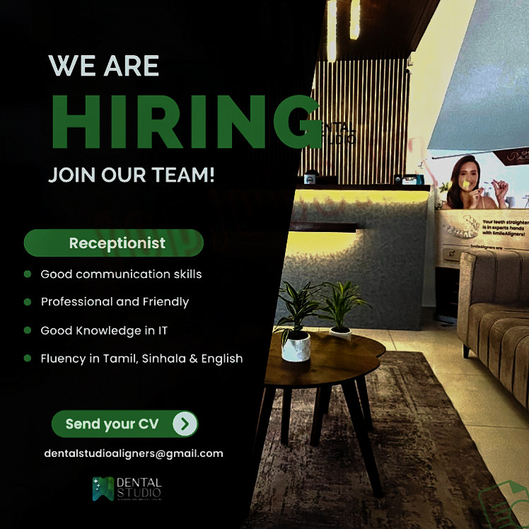 Receptionist Office Admin/Secretary/Receptionist Colombo February 7, 2024 Full Time UrgentApplication deadline closed. Job DescriptionReceptionistGood communication skillsProfessional and FriendlyGood Knowledge in ITFluency in Tamil, Sinhala & EnglishSend your CV (dentalstudioaligners@gmail.com|DENTALSIUDOShare this post Facebook Twitter LinkedIn Pinterest Photos Related Jobs Office Assistant Featured Office Admin/Secretary/Receptionist Colombo Full Time Urgent Parliament of Sri Lanka vacancies Featured Accounting/Auditing/Finance, Customer Relations/Public Relations, Development, Hotels/Restaurants/Food/Bar/Spa, Office Admin/Secretary/Receptionist Sri Lanka Full Time Urgent FACTORY ADMIN OFFICER Featured Office Admin/Secretary/Receptionist Gampaha Full Time Urgent Office Admin / Admin Assistant Featured Office Admin/Secretary/Receptionist Colombo Full Time Urgent
