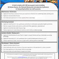 A Hotel complex with 100 luxury guest rooms including 60 Deluxe Rooms, the Palmyrah Restaurant and extensive Conference & Banqueting facilities has staff vacancies.