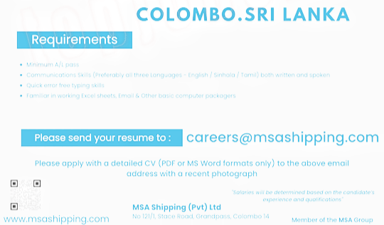 - Communications Skills (Preferably all three Languages English/Sinhala / Tamil) both written and spoken