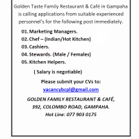 Golden Taste Family Restaurant & Café in Gampaha is calling applications from suitable experienced personnel’s for the following post immediately.
