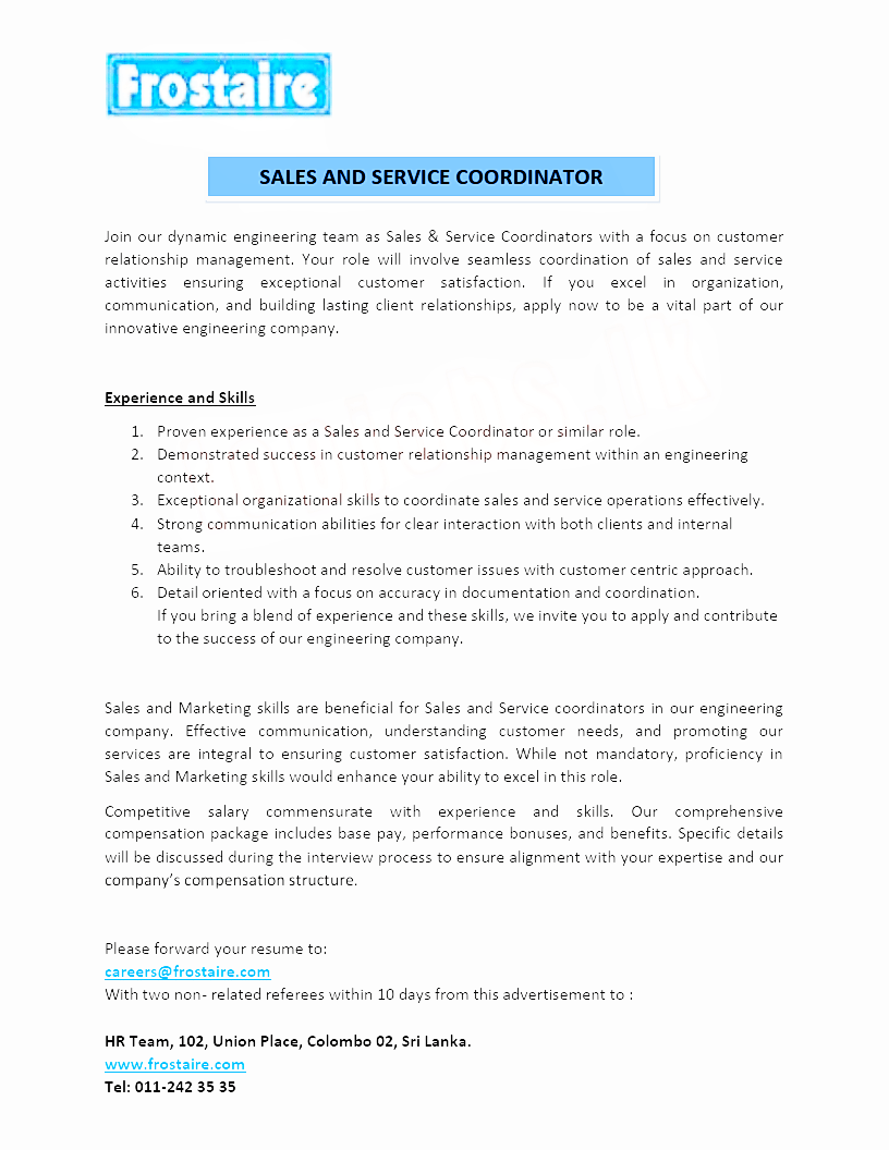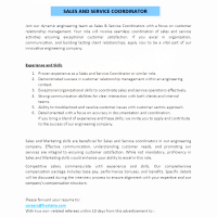 1. Proven experience as a Sales and Service Coordinator or similar role.