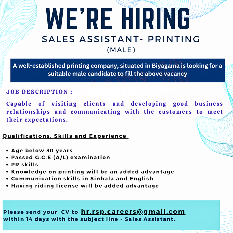 Please send your CV to hr.rsp.careers@gmail.com within 14 days with the subject line – Sales Assistant.