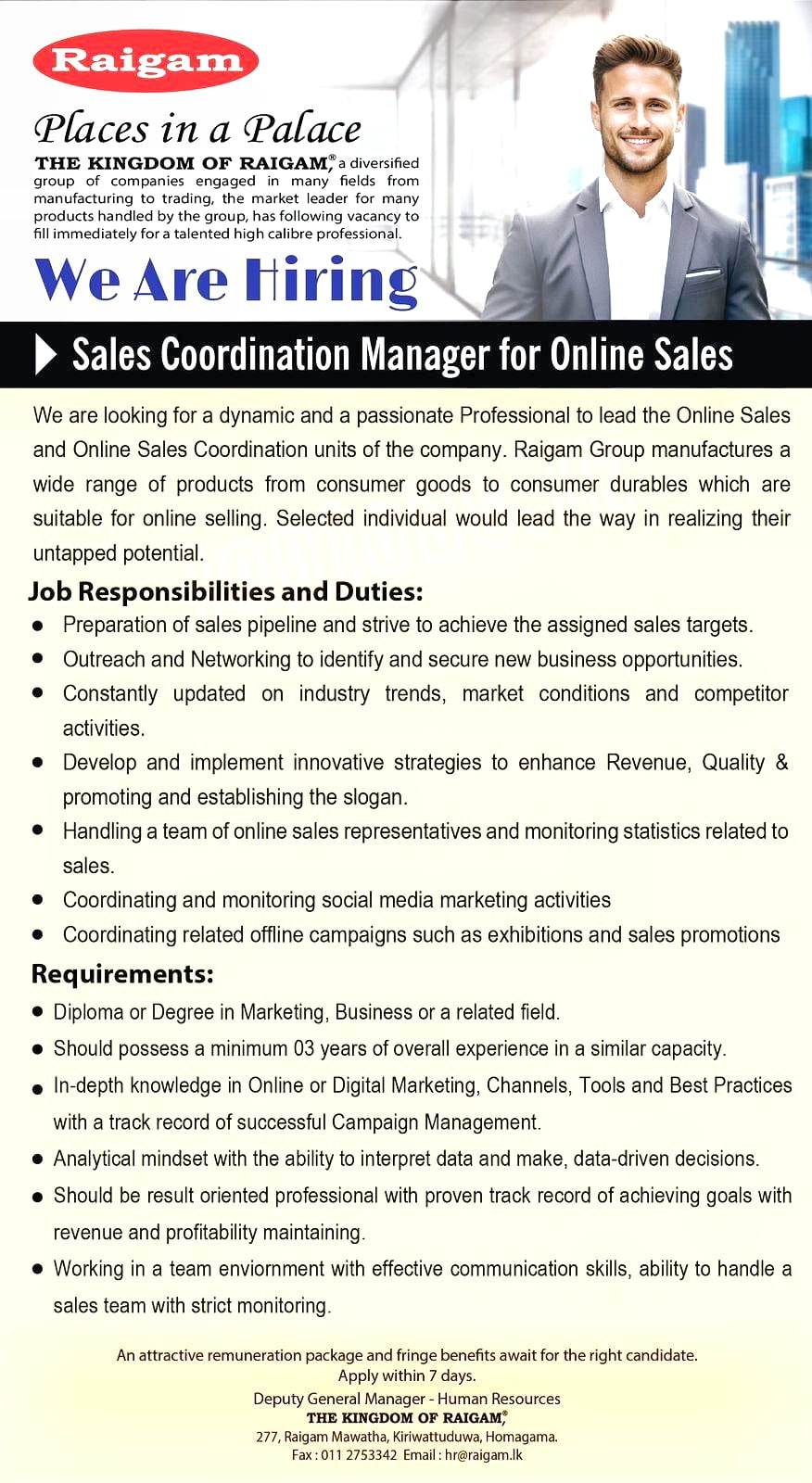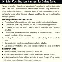 We are looking for a dynamic and a passionate Professional to lead the Online Sales and Online Sales Coordination units of the company. Raigam Group manufactures a wide range of products from consumer goods to consumer durables which are suitable for online selling. Selected individual would lead the way in realizing their untapped potential.