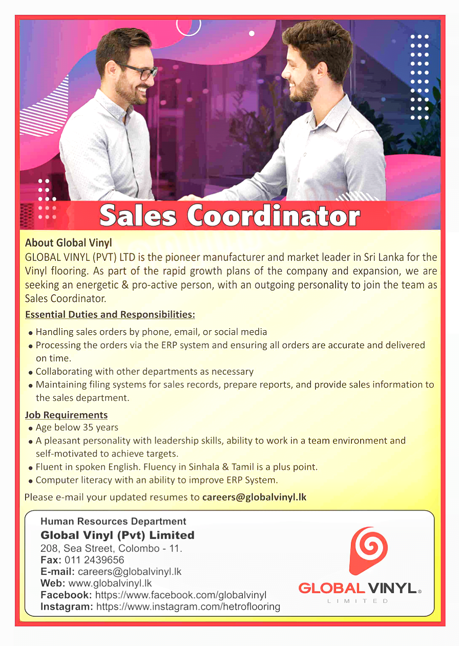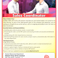 GLOBAL VINYL (PVT) LTD is the pioneer manufacturer and market leader in Sri Lanka for the Vinyl flooring. As part of the rapid growth plans of the company and expansion, we are seeking an energetic & pro-active person, with an outgoing personality to join the team as Sales Coordinator.