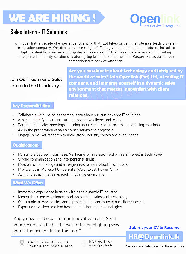 Are you passionate about technology and intrigued by the world of sales? Join Openlink (Pvt) Ltd, a leading IT company, and immerse yourself in a dynamic sales environment that merges innovation with client relations.