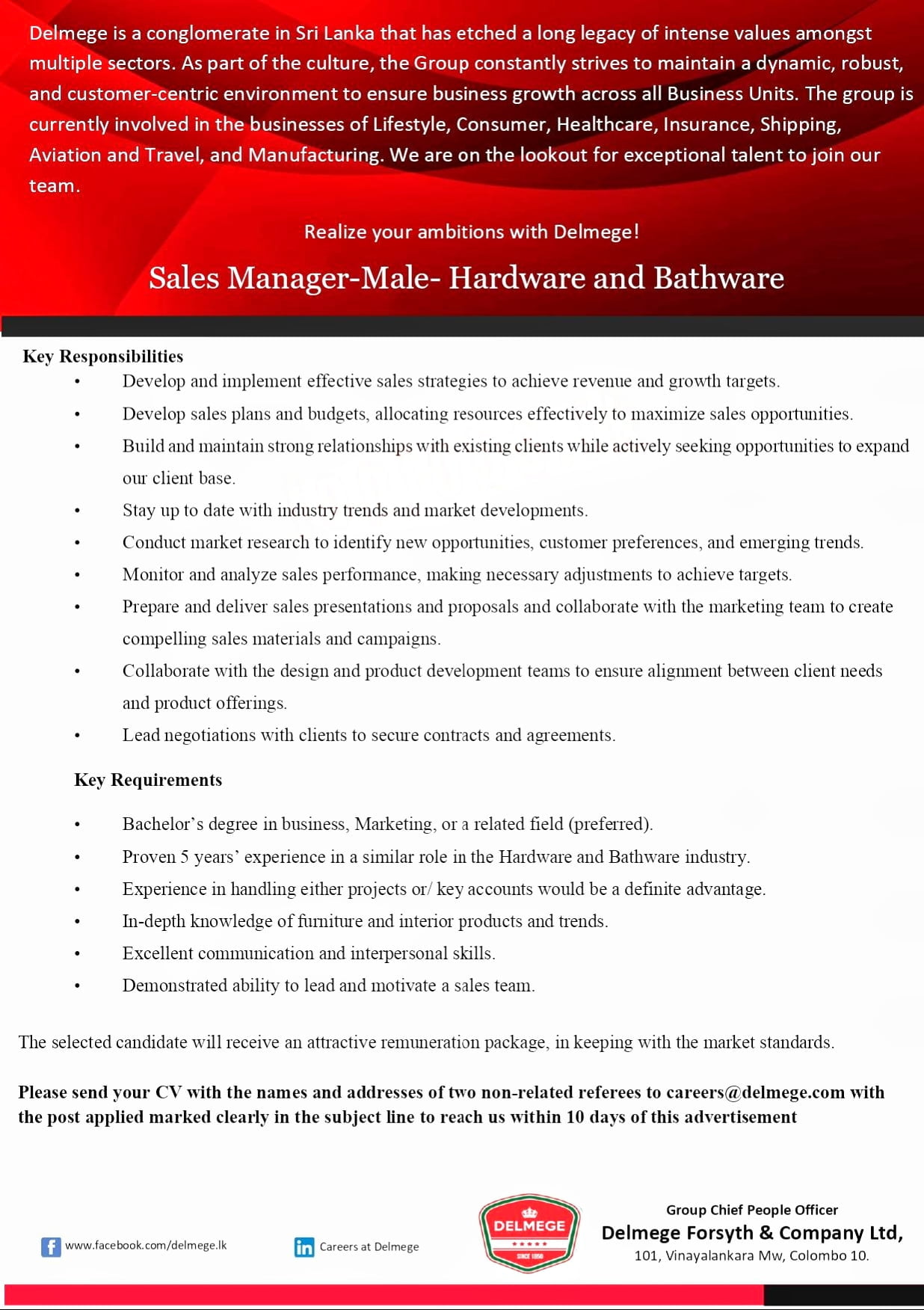 Group Chief People Officer Delmege Forsyth & Company Ltd, 101, Vinayalankara Mw, Colombo 10.