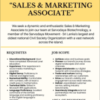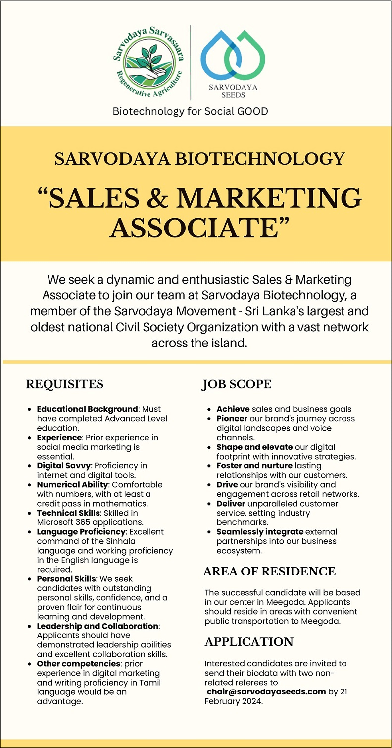 We seek a dynamic and enthusiastic Sales & Marketing Associate to join our team at Sarvodaya Biotechnology, a member of the Sarvodaya Movement – Sri Lanka’s largest and oldest national Civil Society Organization with a vast network across the island.