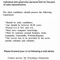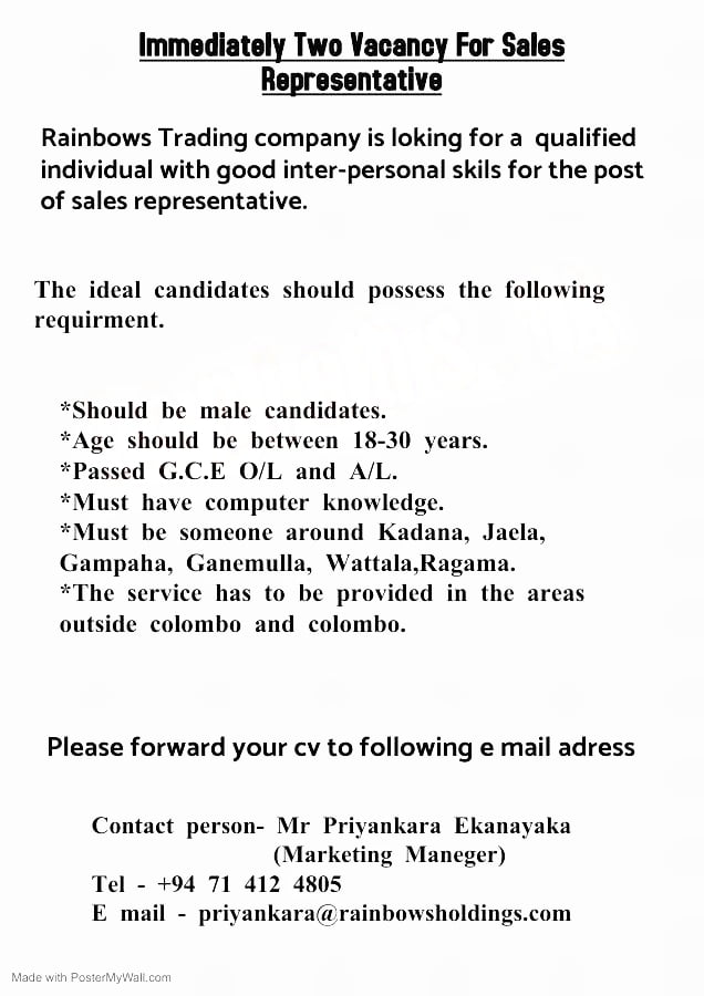 Rainbows Trading company is loking for a qualified individual with good inter-personal skils for the post of sales representative.