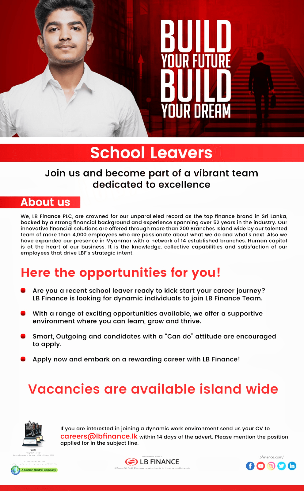 If you are interested in joining a dynamic work environment send us your CV to careers@lbfinance.lk within 14 days of the advert. Please mention the position applied for in the subject line.