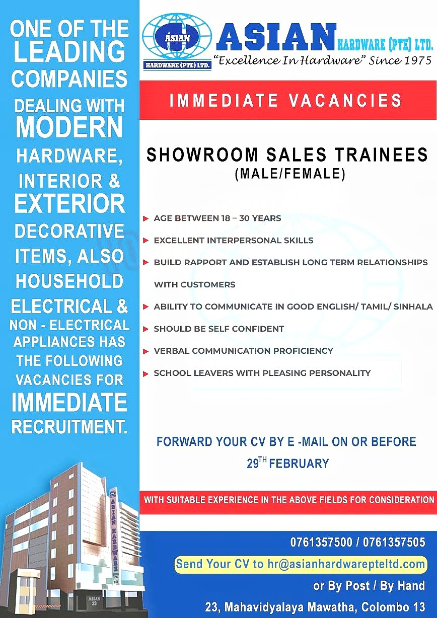 Send Your CV to hr@asianhardwarepteltd.com