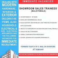 SHOWROOM SALES TRAINEES (MALE/FEMALE)