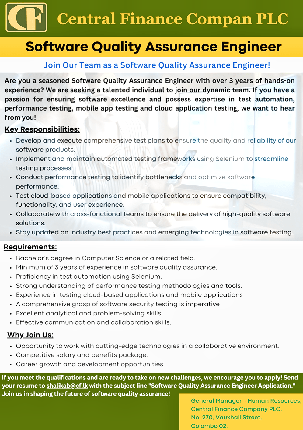 Are you a seasoned Software Quality Assurance Engineer with over 3 years of hands-on experience? We are seeking a talented individual to join our dynamic team. If you have a passion for ensuring software excellence and possess expertise in test automation, performance testing, mobile app testing and cloud application testing, we want to hear from you! Key Responsibilities: Develop and execute comprehensive test plans to ensure the quality and reliability of our software products. Implement and maintain automated testing frameworks using Selenium to streamline testing processes. Conduct performance testing to identify bottlenecks and optimize software performance. Test cloud-based applications and mobile applications to ensure compatibility. functionality, and user experience. Collaborate with cross-functional teams to ensure the delivery of high-quality software solutions. Stay updated on industry best practices and emerging technologies in software testing. Requirements: Bachelor’s degree in Computer Science or a related field. Minimum of 3 years of experience in software quality assurance. Proficiency in test automation using Selenium. Strong understanding of performance testing methodologies and tools. Experience in testing cloud-based applications and mobile applications A comprehensive grasp of software security testing is imperative Excellent analytical and problem-solving skills. Effective communication and collaboration skills. Why Join Us: Opportunity to work with cutting-edge technologies in a collaborative environment. Competitive salary and benefits package. Career growth and development opportunities. If you meet the qualifications and are ready to take on new challenges, we encourage you to apply! Send your resume to shalikab@cf.lk with the subject line “Software Quality Assurance Engineer Application.” Join us in shaping the future of software quality assurance! General Manager – Human Resources, Central Finance Company PLC, No. 270, Vauxhall Street, Colombo 02.