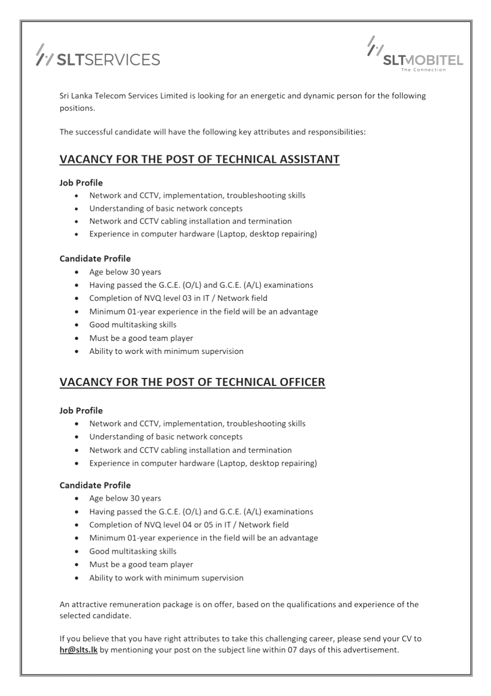 If you believe that you have right attributes to take this challenging career, please send your CV to hr@slts.lk by mentioning your post on the subject line within 07 days of this advertisement.