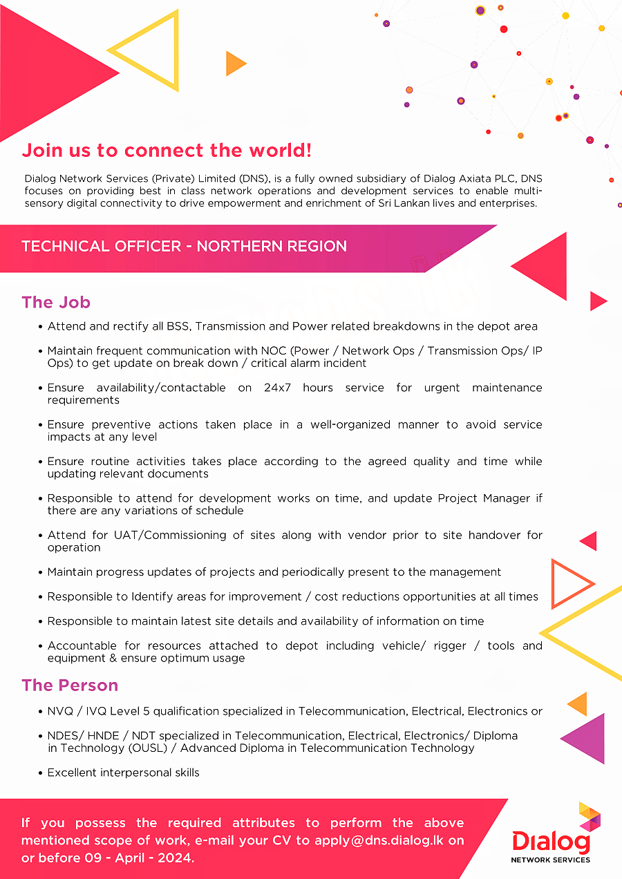 If you possess the required attributes to perform the above mentioned scope of work, e-mail your CV to apply@dns.dialog.lk on or before 09-April-2024.