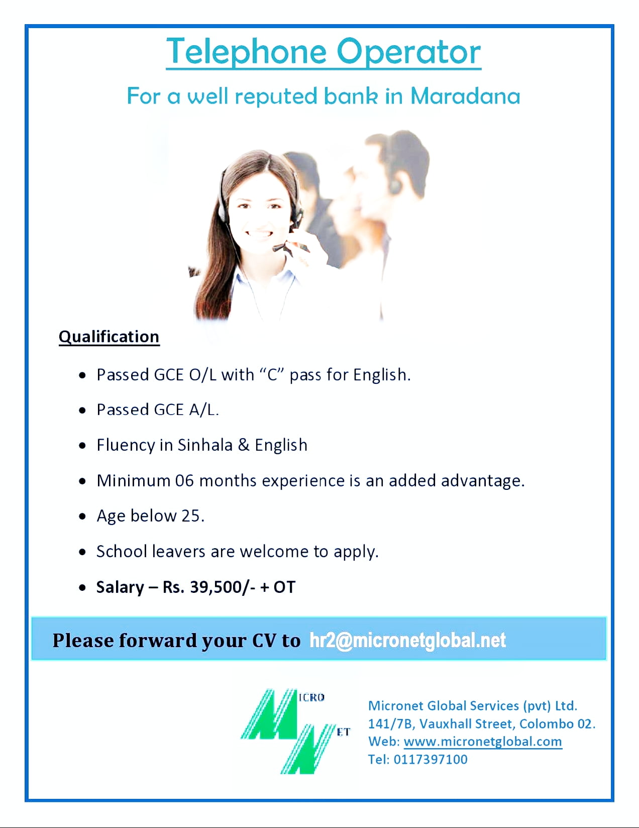 Please forward your CV to hr2@micronetglobal.net