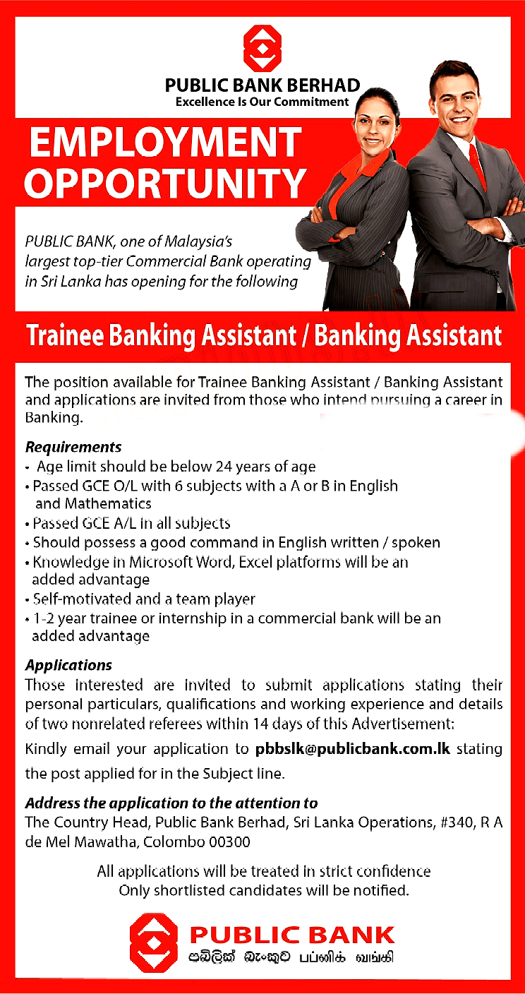 Those interested are invited to submit applications stating their personal particulars, qualifications and working experience and details of two nonrelated referees within 14 days of this Advertisement: Kindly email your application to pbbslk@publicbank.com.lk stating the post applied for in the Subject line.