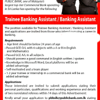 The position available for Trainee Banking Assistant / Banking Assistant and applications are invited from those who intend pursuing a career in Banking.