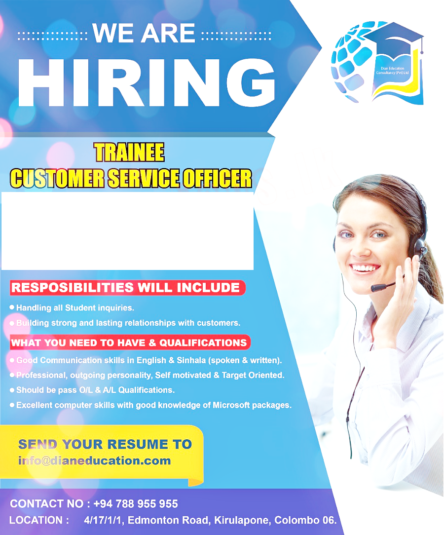 Good Communication skills in English & Sinhala (spoken & written). • Professional, outgoing personality, Self motivated & Target Oriented. - Should be pass O/L & A/L Qualifications.