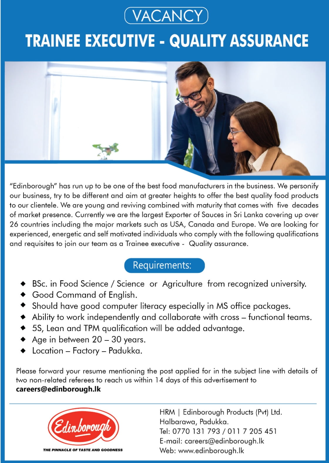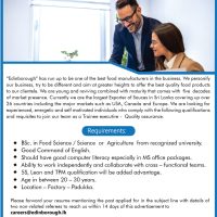 “Edinborough” has run up to be one of the best food manufacturers in the business. We personify our business, try to be different and aim at greater heights to offer the best quality food products to our clientele. We are young and reviving combined with maturity that comes with five decades of market presence. Currently we are the largest Exporter of Sauces in Sri Lanka covering up over 26 countries including the major markets such as USA, Canada and Europe. We are looking for experienced, energetic and self motivated individuals who comply with the following qualifications and requisites to join our team as a Trainee executive Quality assurance.