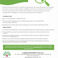 K Seeds Investments (Pvt) Ltd is a boutique Investment bank, focused on providing financial advisory and solutions. We are currently seeking a candidate with interest on numbers for the position of Trainee Financial Analyst. The employee will be exposed to a wide array of financial services, including treasury management, restructuring, private equity and research etc.