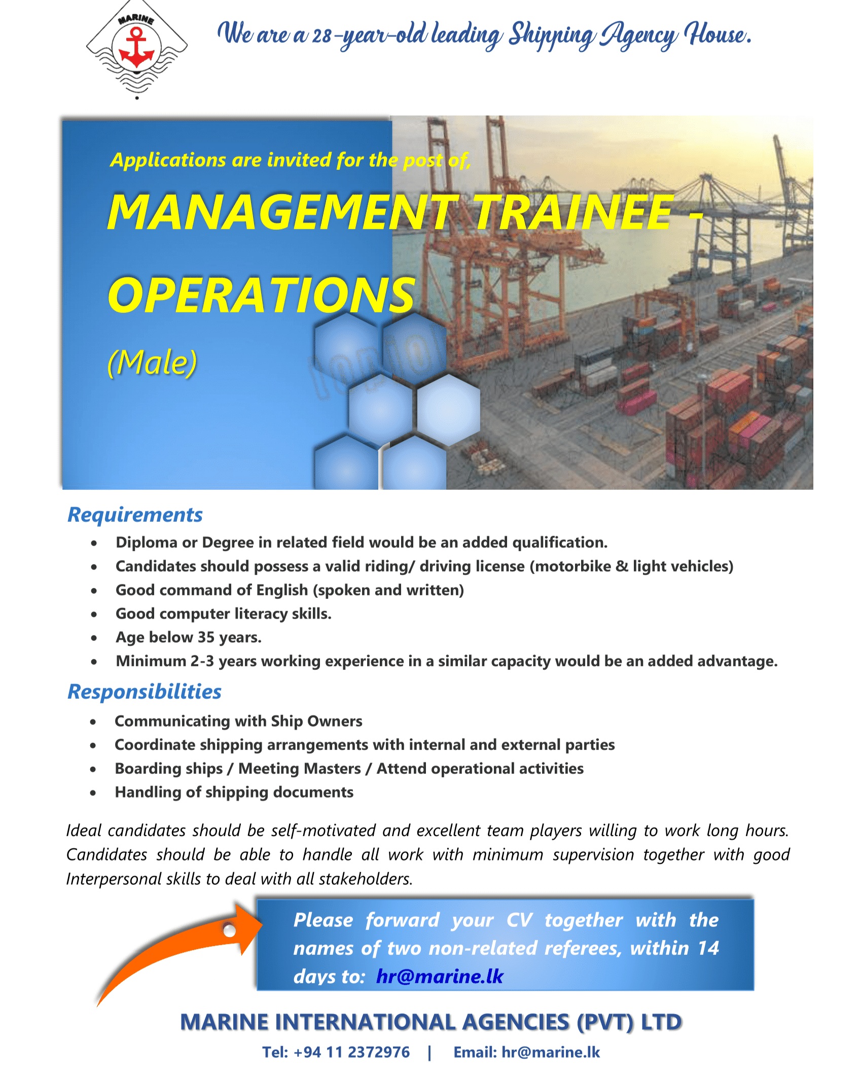 Please forward your CV together with the names of two non-related referees, within 14 days to: TRAINEE OPERATIONS (Male) hr@marine.lk
