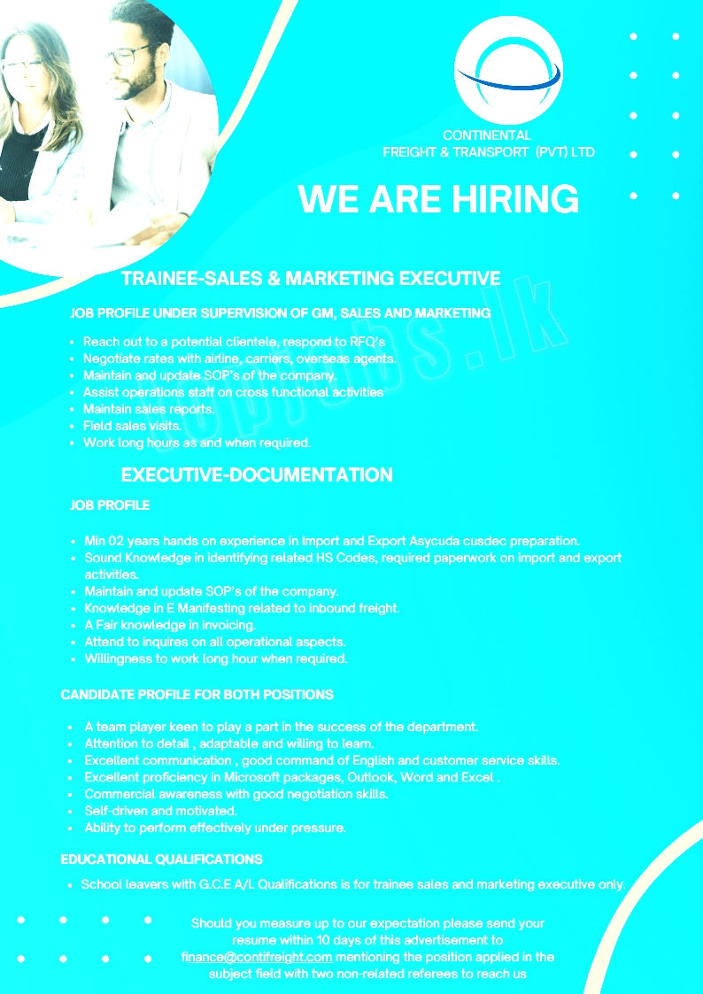 • School leavers with G.C.E A/L Qualifications is for trainee sales and marketing executive only.