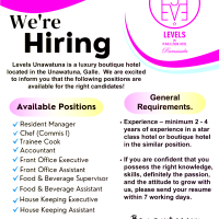 We are excited to inform you that the following positions are available for the right candidates! Available Positions ✓ Resident Manager ✓ Chef (Commis I) ✓ Trainee Cook ✓ Accountant ✓ Front Office Executive ✓ Front Office Assistant ✓ Food & Beverage Supervisor ✓ Food & Beverage Assistant ✓ House Keeping Executive ✓ House Keeping Assistant Send your resume to management@levelsunawatuna.com • EV3 ✩ LEVELS BY PEARL LEISURE HOTEL Rumassala General Requirements. Experience – minimum 2 – 4 years of experience in a star class hotel or boutique hotel in the similar position. . If you are confident that you possess the right knowledge, skills, definitely the passion, and the attitude to grow with us, please send your resume within 7 working days. Be a part of our amazing team… https://levelsunawatuna.com/