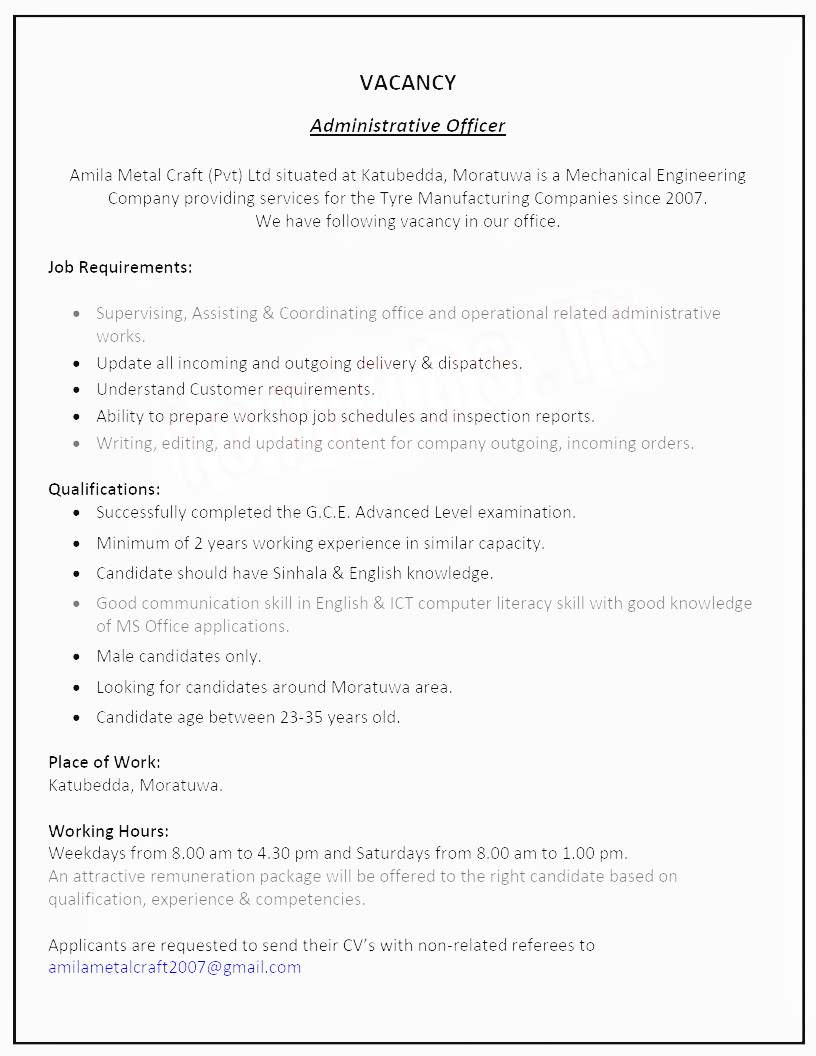 Successfully completed the G.C.E. Advanced Level examination. - Minimum of 2 years working experience in similar capacity.
