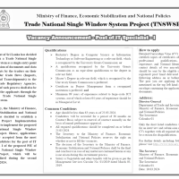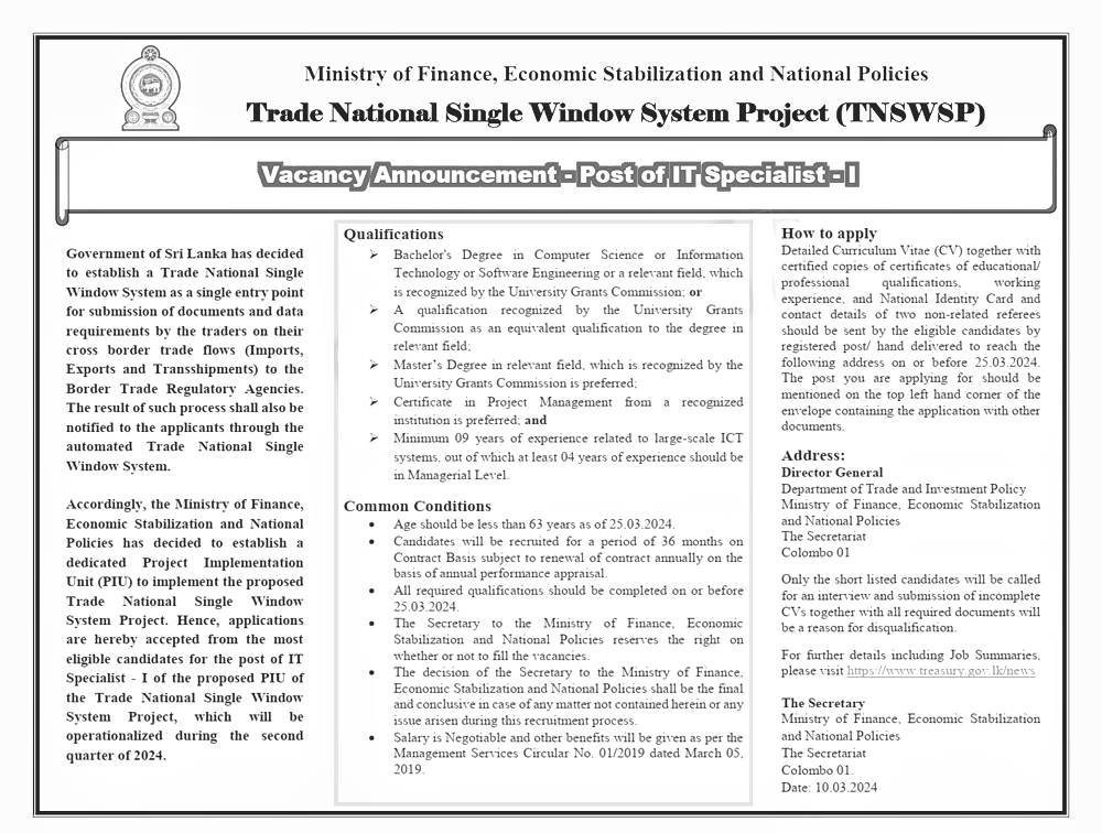Accordingly, the Ministry of Finance, Economic Stabilization and National Policies has decided to establish a dedicated Project Implementation Unit (PIU) to implement the proposed Trade National Single Window System Project. Hence, applications are hereby accepted from the most eligible candidates for the post of IT Specialist I of the proposed PIU of the Trade National Single Window System Project, which will be operationalized during the second quarter of 2024.